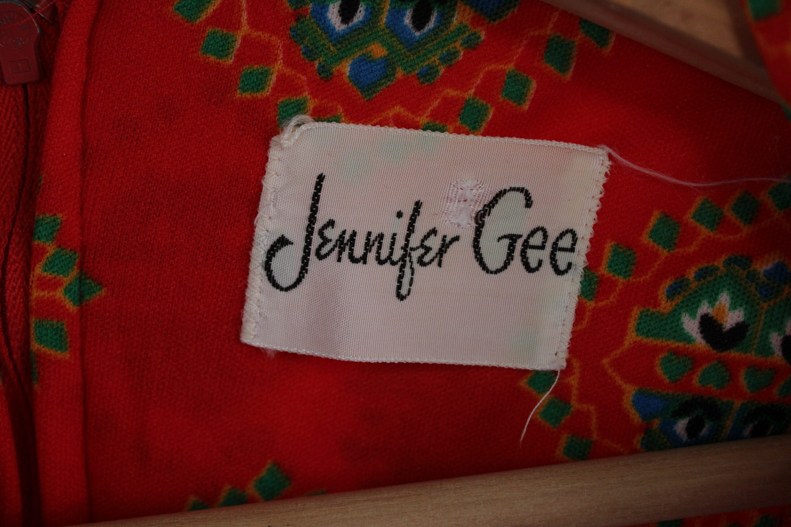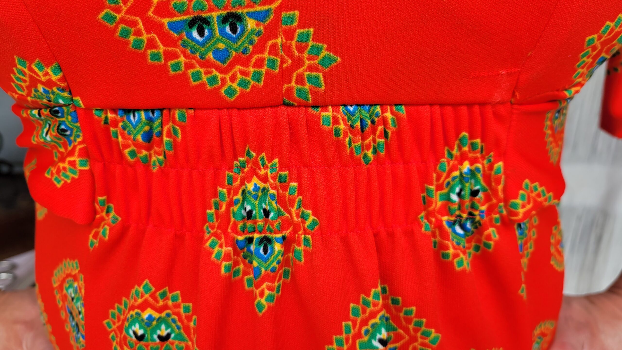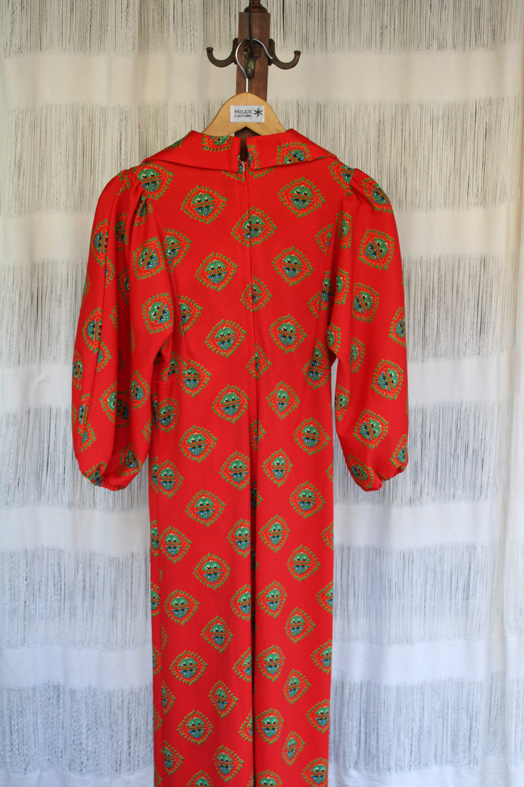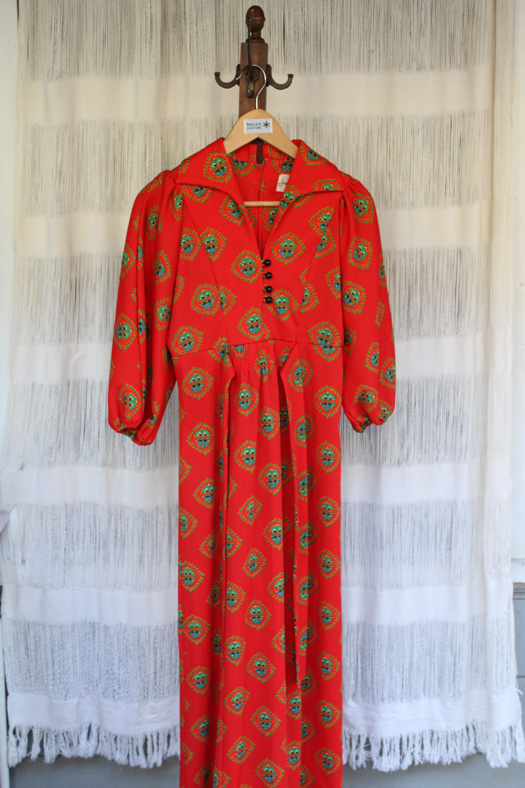 Vintage Ethnic Maxi-Dress in red color with unique bright print in diamond shape.